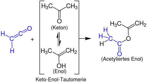 Enolestery se z ketenů dají získat reakcemi s enolizovatelnými karbonylovými sloučeninami. Na následujícím obrázku je uvedena reakce ethenonu s acetonem, jejímž produktem je propen-2-ylacetát: