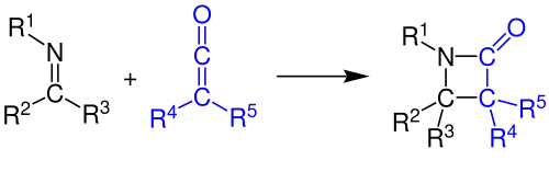 Keteny mohou reagovat s alkeny, karbonylovými sloučeninami, karbodiimidy a iminy [2+2] cykloadicích. Na následujícím obrázku je uvedena příprava β-laktamu reakcí ketenu s iminem (což je Staudingerova syntéza):[14][15]