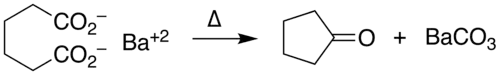 Příkladem vnitromolekulární ketonizace může být přeměna kyseliny adipové na cyklopentanon za přítomnosti hydroxidu barnatého.[7]