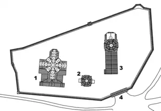 Samotná stavba se seskládá ze čtyř částí, které jsou postaveny za sebou ve směru ze západu na východ: Prvně síň, potom jídelna, chrám (nejvyšší část stavby) a oltářní přístavek.