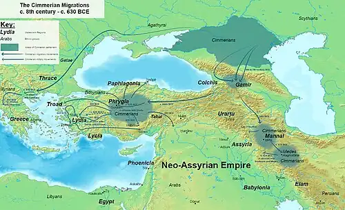 V období mezi 8. a 6. stoletím př. n. l. Kimmeriové podnikli nájezdy proti národům Malé Asie. V bitvě u Gamiru v Kappadokii v roce 707 př. n. l. porazili vojsko Urartu (z dobového pramenu: zpráva asyrského prince Senancheriba, kterou zaslal svému otci králi Sargonu II.). Kolem roku 696př. n. l. Kimmeriové dobyli a zničili království Frýgie krále Midase a vyvrátili sídelní město Gordion (pád Gordia byl potvrzen archiologickým průzkumem). Kolem roku 663 př. n. l. Kimmeriové napadli bohaté království Lýdie, utkali se s vojskem lýdského krále Gýga, který odrazil útok až za pomoci asyrského krále Aššurbanipala. Kolem roku 640 př. n. l. kimmerijská armáda zpustošila hlavní město Lýdie Sardy (král Gýges v boji zahynul).[3] V roce 637 nebo 625 př. n. l. lýdský král Alyattes vyhnal armádu kimmerijského krále Dugdammeho (kimmerijský král v boji padl).