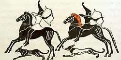 Reprodukce zobrazení kimmerijských jízdních lukostřelců z řecké vázy.