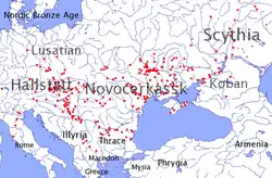 Rozmístění „trácko-kimmerijských“ nálezů. Mapa z Archeologie ukrajinské SSR (rus. Археология Украинской ССР) vol. 2, Kyjev (1986)