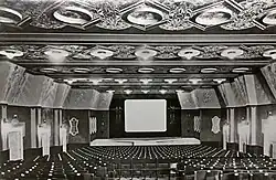 Původní interiér kina byl navržen ve stylu rondokubismu se štukovou a malovanou výzdobou stěn ve stylu art deco. Ve Stavitelských listech č.1 z roku 1924 je uváděn jako autor původní výmalby stěn, kde na blankytně modrém podkladě byly zobrazeny múzy a ornamenty ze zlatých lipových větviček doplněných trikolorou ak. mal. Josef Šimák, zatímco autorem černobílého ornamentu na stropě je František Kysela, kterého uvádí památkář ing. arch. Václav Girsa. První necitlivá přestavba kina, která překryla původní výzdobu stěn (malby jsou zachovány pod omítkou), proběhla v 70. letech 20. století, ale styl interiéru zůstal zachován včetně prvků původních dveří, kování nebo ozdobných mřížek od vzduchotechniky. Velký, vyvýšený prostor před promítacím plátnem nabízí využití jako divadelní jeviště.