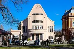 Budova má nápadné průčelí s dominujícím balkonem, pod kterým se nachází hlavní vchod do budovy s vysokým schodištěm.