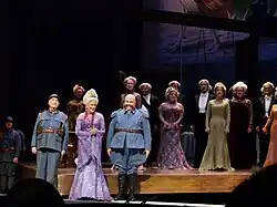 Kiri Te Kanawa (první řada uprostřed) jako vévodkyně z Krakentorpu v opeře Gaetana Donizettiho Dcera pluku. Metropolitní operaNew Yorku, 24. prosince 2011.