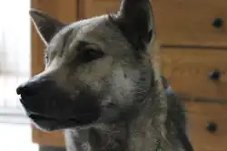 Hlava je přiměřeně velká, v poměru mozkovny ku čumáku 1:1. Uši jsou středně velké, trojúhelníkovité, natočené vždy dopředu. Oči jsou spíše mandlového tvaru v barvě oříšků, ale bez viditelného bělma. Nosní houba je většinou černá, ale v bílých variantách může být růžová či hnědá. Skus nůžkový, se silnými zuby. Krk je silný a široký, poměrně krátký a klenutý. Srst na něm tvoří límec. V místech, kde se napojuje na hřbet může být nepatrná prohlubeň. Hřbet je dlouhý, široký, hustě porostlý srstí, zakončen dlouhým ocasem šavlovitého tvaru. Na něm tvoří dlouhá srst prapor. Nohy dlouhé, svalnaté, zakončené kulatými tlapkami.
