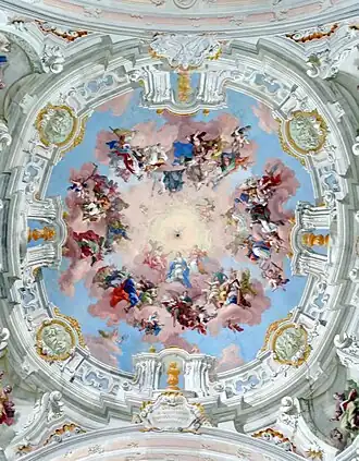 Působivě zařízený rokokový interiér ovládají především fresky na klenbách: Korunování Panny Marie mezi evangelisty, církevními otci a světci, které maloval Bartolomeo Altomonte. Obraz Nanebevzetí Panny Marie na hlavním oltáři namaloval opět Altomonmte, stejně jako oltářní obraz sv. Jana Nepomuckého. Šest bočních oltářů je zasvěceno zmíněnému Janu Nepomukovi, sv. Josefovi, svaté Cecílii, Andělovi-strážci, Ukřižování Krista a Dětství Krista a Jana Křtitele. Sochařskou výzdobu a štukatury vytvořil Johann Georg Üblhör, řezbářskou výzdobu oltářů, kazatelny a prospekt varhan dodal Joseph Deutschmann. Pasovský kníže-biskup Leopold Ernst von Firmian vysvětil kostel 21. října 1764.