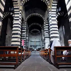 Klášter s kostelem je umístěn za velkým náměstím na náhorní plošině na vrcholu kopce, ve výšce asi 540 metrů nad mořem. Vnější vzhled kostela je charakterizován prokládáním černých (čedič) a světle bílých (pískovec) kamenů, což je typický znak pro středověké kostely v oblasti Pisy v Toskánsku. Fasáda je rozdělena do čtyř horizontálních sektorů: tři nižší sektory (portál a sektory nad ním) mají slepé arkády a lodžie zdobené kosočtverci, další typickou výzdobou současných toskánských církevních staveb. Na prvním stupni portálu je nápis Mariane maistro, pravděpodobně jméno zedníka ("Mistr Marianus"), který stavbu řídil. Boky a apsida jsou zdobeny lombardskými pásy. V interiéru je hlavní loď a dvě oční lodě, rozdělené osmi křížovými pilíři s černobílými pásy, nad nimiž jsou zaoblené oblouky. V lodi je křížová klenba a několik sloupkových oken; stěna západního průčelí má dvojité sloupkové okno a okulus. V severní uličce je umístěna socha Madony s dítětem z 15. století. U třetího pilíře je mramorová kazatelna v gotickém stylu, jejíž datování je nejisté (možná 14. století).