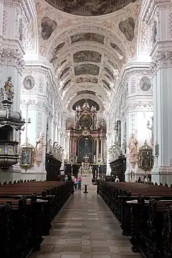 Kostel má trojlodní dispozici na půdorysu latinského kříže s pravoúhlým závěrem, se dvěma věžemi v průčelí a se dvěma řadami výklenkových kaplí v bočních lodích, nad nimiž jsou kruhová okénka (tzv. okuly) a dvě řady empor, na západní stěně je dvojetážová kruchta. V křížení je kupole. Celková délka chrámu s chórem činí 82 metrů.