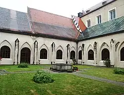 Trojkřídlý patrový konvent byl postaven ve stejné době jako přilehlý kostel. Křížová chodba je zaklenutá gotickou křížovou klenbou doplněnou rokokovými štukaturami a malbami. Kapitulní síň je členěna dvěma štíhlými osmibokými pilíři s vyžlabením a zakončenými hlavicí. Z nich vybíhá osm žeber hruškovitého tvaru. Žebra se protínají v hladkých svornících a sbíhají na konzoly, které nemají jednotný tvar. Klenební konzoly v obvodových zdech nejsou jednotné. V kapitulní síni můžeme vidět i patrovou konzolu. Spodní část konzoly vypadá jako obrácený jehlanec. Horní část konzoly je rozdělena do dílců odpovídajících počtu nesených žeber. V některých rozích kapitulní síně jsou konzoly s motivem maskaronů vytesány ze žuly. Nad vchodem se nachází v štuku provedený klášterní erb. Na klenbě v zeleném odstínu uprostřed rokokového ornamentu je alegorie. Na severní straně jsou tři vysoká lomená okna a vstup do klášterního ambitu.