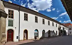 Vstup do kláštera minoritů z Minoritské ulice v Brně. Nad vstupem je znak minoritů, zkřížené ruce
