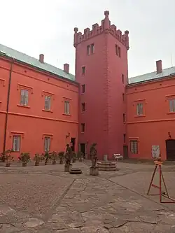 Nádvoří má čtverhranný půdorys, narušený stavbou věže ve východním nároží a drobným trojbokým přístavkem v jižním nároží. V západním nároží stojí trojboký arkýř na profilované konzole. Portál do věže je bosovaný a nad ním je uchycena kamenná deska s erbem Fictumů a Šliků s letopočtem 1590. Uprostřed nádvoří je malá kašna.[10]
