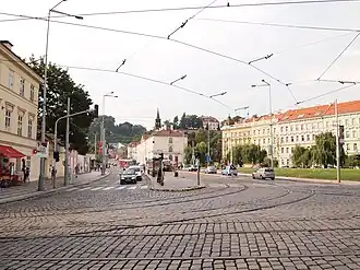 - Mánesův most – na východní straně, vede na náměstí Jana Palacha
