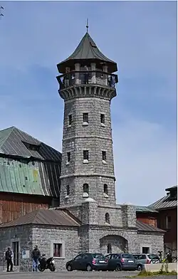 Kvůli silnému větru panujícímu téměř celoročně byla vrchní plošina rozhledny zastřešena, od roku 1888 ji kryla skleněná střecha. Vstupné v té době bylo deset krejcarů. S rozvojem turistiky bylo rozhodnuto o přístavbě sloužící k ubytování. Ta byla otevřena 18. srpna 1893. V provozu byla každoročně od 1. května do 30. září a mimo provizorního ubytování pro deset osob poskytovala i teplá a studená jídla. Spolu s přístavbou byla zřízena i stáj pro osm koní.