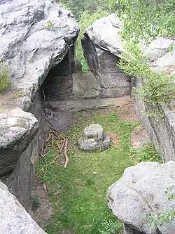 Hrad stál na pískovcové ostrožně s kolmými stranami oddělené od zbytku skalní plošiny úzkou šíjí. Tu přehrazuje val, který byl vybudován již jako součást pravěkého hradiště. Vrcholové plošiny skal nevykazují stopy zástavby, jen na jižní straně se dochovala ve skále vysekaná cisterna. V zadní části hradu, částečně zničené lomem, se nachází rozsedlina se čtyřmi světničkami. Ve dvou světničkách se dochovaly kamenné stoly a v jedné z nich i zbytky náročněji přitesaného okna. Architektonické prvky umožnily jejich dataci do 15. století.[3]