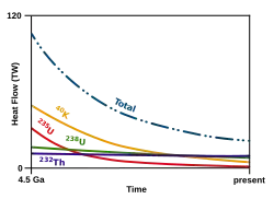 Teplota uvnitř Země postupně klesá. Teplota zemského pláště se ochlazuje přibližně o 100 °C za miliardu let.[43] Původní geotermální gradient byl v důsledku větší radioaktivity Země větší než dnes a tak bylo odplyňovaní Země větší. To hrálo důležitou roli ve formování atmosféry.