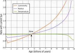Zářivý výkon Slunce nyní podle modelů vzrůstá přibližně o procento za 110 miliónů let.[71] Tomu tedy odpovídá za danou dobu nárůst teploty přibližně o čtvrt procenta (tedy přibližně o 0,7 °C za 110 miliónů let). Ovšem tento přirozený přírůstek byl pravděpodobně v historii Země kompenzován. To ukazuje takzvaný paradox slabého mladého Slunce, když na počátku existence Země vyzařovalo Slunce (podle standardních modelů) přibližně jen 70 % současné hodnoty, ale teplota na povrchu Země byla značně vyšší. Za miliardu let však už může Země být neobyvatelná.[72] V dlouhodobém horizontu se očekává pokles koncentrace oxidu uhličitého (za přibližně půl miliardy let se zastaví koloběh uhlíku), což způsobí masové vymírání rostlin a tak i živočichů.[47]