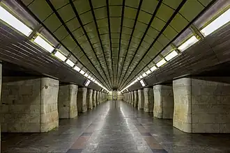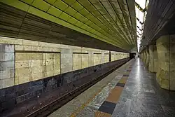 ![]() ![]() ![]() Horní obrázek je střední loď stanice Dolní obrázek vlevo je dekorativní kompozice na biologické téma na konci střední lodi stanice Dolní obrázek vpravo je nástupiště stanice s kolejovou zdí, pilíři a podlahou | |||||||||||||||||||||||||||||||||||||||||||||||||||||||||||||||||||||||||||||||||||||||||||||||||||||||||||||||||||||||||||||||||||||||||||||||||||