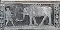 První výjev zleva zobrazuje mužskou postavu a slona, pravděpodobně jde o biblický výjev Eleazara, který se jde obětovat za židovské vojsko.[6] Zobrazení slona má pravděpodobně prapůvod v rytině Martina Schongauera z let 1470–1491.[11]