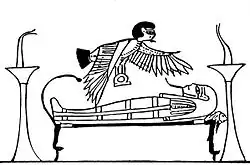 Existují také obrazy lvích sedaček, kde je pouze mumifikovaný člověk a andělský/božský pták, který má mrtvého vzkřísit z mrtvých. Jde o mytologickou ozvěnu Usirova mýtu, v němž byl bůh vzkříšen svou manželkou/sestrou Eset, která naněj dosedla v podobě holubice. V pozdní době byla holubice někdy chápána jako duše mrtvého, která se vrací do vzkříšeného těla.