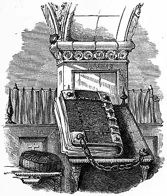 Knihy zde byly uloženy na deseti pulpitech, čtenářských pultech, které byly označeny římskými písmeny alpha až kappa. Jednalo se o z obou stran přístupné stoly, z nichž měl ze dvou protilehlých stran dvě zešikmené desky s uloženými knihami. Chebské svazky knih na řetězu byly opatřeny krátkými mohutnými řetězy a z toho vyplývá, že byly uloženy přímo na deskách pultů, nikoli na policích.