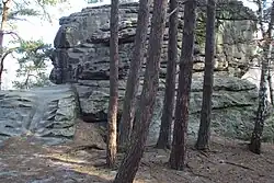 Výrazná skála z pískovce s vytesanými a vymletými schody získala jméno podle zdejšího lidového zvyku shazování figuríny Smrti do rybníka na počátku jara.