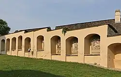 - Řady barokních soch světců v ambitu a na bráně hřbitova