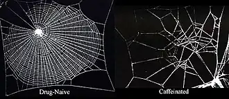 Pokusy na členovcích (např. na pavoucích) bylo zjištěno, že kofein patří mezi alkaloidy působící největší chaos v informační výměně buněk včetně neuronů. Pavouci ovlivnění kofeinem spřádali síť chaotičtěji než ti ovlivnění LSD nebo heroinem. Tok informací není přerušen, ale dochází častěji k chybám, což působí zvýšená hladina informačního šumu. Důsledky tohoto faktu u člověka nejsou zcela jasné, určitou podobnost můžeme pozorovat u osob na kofein přecitlivělých.