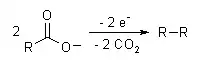 - 3 R1COO− + 3 R2COO− → R1−R1 + R1−R2 + R2−R2 + 6 CO2 + 6 e−