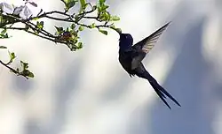- ↑ a b c ONIKI, Y.; WILLIS, E. O. Nesting behavior of the swallow-tailed hummingbird, Eupetomena macroura (Trochilidae, aves). Revista Brasileira de Biologia. 2000-11-01, roč. 60, čís. 4, s. 655–662. Dostupné online [cit. 2017-03-12]. ISSN 0034-7108. doi:10.1590/S0034-71082000000400016.