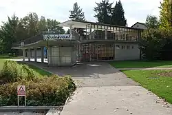 Krátké moderní kolonády z hřibových prvků na koupališti Allenmoos v Curychu