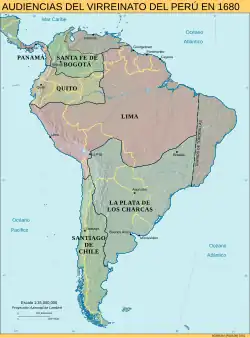 Místokrálovství byla rozdělena do menších správních jednotek, které se členily buď do guvernie (gobernaciones), generálního kapitanátu nebo do audiencie. Guvernie měla vládní (či správní) charakter, generální kapitanát vojenský a audiencie soudní. V rámci guvernie existovaly menší obvody alcadía mayor nebo corregiemento. Obecně lze nižší správu ve španělské Jižní Americe charakterizovat jako poměrně nejednotnou. Vlastní správu měli domorodí obyvatelé a jinou správu koloniální města, která byla organizovaná a stavěná podle evropských vzorů. Města byla spravována městskými radami (cabildo).