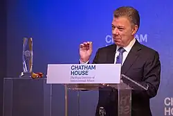 Občanská válka v Kolumbii si do roku 2012 vyžádala na 220 tisíc obětí a více než 5 milionů Kolumbijců muselo opustit své domovy.[38] V roce 2015 vláda Juana Manuela Santose uzavřela s povstalci FARC mírovou smlouvu a prominula jim jejich zločiny.[39] Referendum o ratifikaci dohody však bylo neúspěšné.[40] Revidovanou mírovou dohodu poté kolumbijská vláda a FARC podepsaly v listopadu 2016.[41] Vláda ji tentokrát pro jistotu nechala schválit jen kongresem.[42] Za mírové snahy byla prezidentu Santosovi udělena Nobelova cena míru.[43]