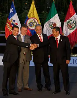 V červnu 2018 zvítězil v prezidentských volbách Iván Duque.[44] V únoru 2019 venezuelský prezident Nicolás Maduro přerušil diplomatické styky s Kolumbií poté, co Duque pomohl venezuelským opozičním politikům doručit humanitární pomoc do jejich země.[45] Kolumbie vzápětí uznala venezuelského opozičního vůdce Juana Guaidóa za legitimního prezidenta země. V lednu 2020 Kolumbie odmítla Madurův návrh, aby obě země obnovily diplomatické vztahy.