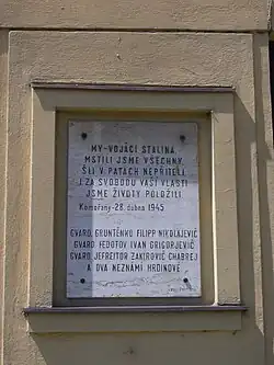 - Pamětní deska padlých sovětských vojáků umístěná na budově obecního úřadu, odhalena 28. dubna 1946