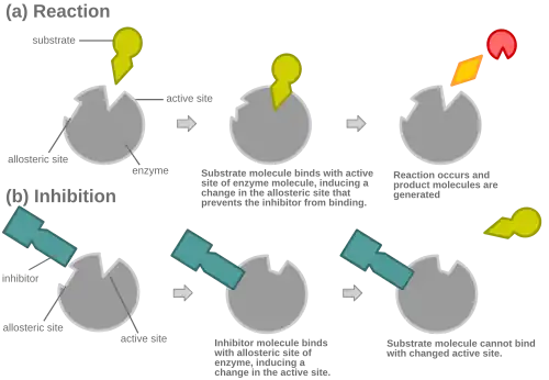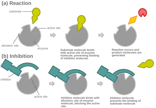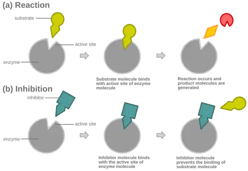 Při kompetitivní inhibici enzymatické reakce navázání inhibitoru zablokuje aktivní místo a brání tak navazování cílové molekuly daného enzymu.[1]
