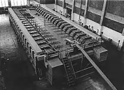 - Komplex K-25 používal metodu plynové difuze a byl dokončen poslední (do provozu byl uváděn postupně po částech, nakonec celkem 2892 stupňů).[15][14] Koncem roku 1945 byl dokončen ještě menší sousední komplex K-27.[16]