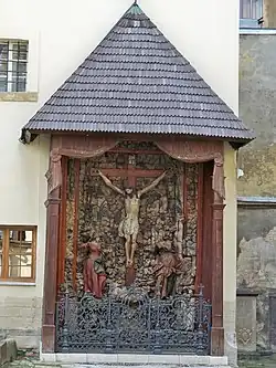 Jižní nádvoří je spojeno s východním nádvořím branou s barokním štítem z roku 1877, a odděleno od ulice Arménské kovovým, mřížovým plotem. Ve výklenku plotu z ulice je socha s datem „1664“ - charakteristickým příkladem lvovské sochy druhé poloviny 17. století, podle některých vědců od lvovského sochaře M. Erlemberga. U jižní zdi katedrály se rozprostírá otevřená arkádová galerie z roku 1437. Na prázdné zdi domu je instalována dřevěná plastika "Ukřižování/Golgota" z 18. století.