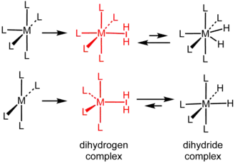V roce 1984 objevili Kubas et al., že adicí H2 na fialově zbarvené sloučeniny M(CO)3(PR3)2 vznikají žluté sraženiny produktů s obecným vzorcem mer-trans-M(CO)3(PR3)2(H2) (M = Mo nebo W; R = cyklohexyl nebo isopropyl).[5] Následně byla objevena řada dalších podobných komplexů, jako jsou Cr(H2)(CO)5[6] a [Fe(H2)(H)(dppe)2]+.[7]
