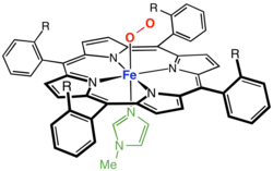 Vazby typu η1-O2 se vyskytují v kobaltnatých a železnatých komplexech porfyrinů (a podobných aniontových makrocyklických ligandů). Významnými příklady jsou myoglobin a hemoglobin, je také známa řada syntetických analogů s podobnými vlastnostmi. Navázání O2 se často popisuje jako přesun elektronů z dvojmocného kovového centra za vzniku superoxidového (O