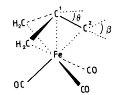 Komplex η4-C(CH2)3]Fe(CO)3 má ligandy, karbonyl a trigonálně pyramidální trimethylenmethan, uspořádané v deštníkovité konfiguraci. Centrální atom uhlíku v trimethylenmethanu se oproti ostatním nachází blíže k železnému centru (194(1) pm oproti 212 pm);[9] tyto údaje byly potvrzeny rentgenovou difrakcí a vibračním spektrem.[10]