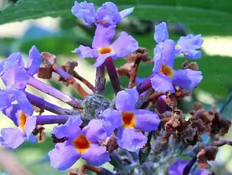 Květy jsou oboupohlavné a vytvářejí úzká hroznovitá květenství vyrůstající na koncích letorostů, vonné květy mají krátké stopky s čárkovitými listenci. Květenství je válcovité, přímé nebo na konci převislé, dlouhé 10 až 30 cm a široké 3 až 5 cm. Zvonkovitý kalich je asi 3 mm dlouhý a jeho čtyři zelené, špičaté cípy jsou hustě chlupaté. Řepicovitá koruna má úzkou trubku asi 10 mm dlouhou, na konci s lemem rozšířeným do čtyř laloků, u botanického druhu mají korunní lístky barvu lila (pastelově fialovou). Čtyři tyčinky s drobnými prašníky jsou kratší než korunní trubka, dvoudílný semeník je protáhle vejčitý, čnělka nese kyjovitou bliznu. Rostlina není samosprašná a tvorba semen je závislá na opylovačích. Květy produkují hodně nektaru, a proto mají opylovačů dostatek, jsou to hlavně včely, motýli (denní i noční), sršně a v Americe i kolibříci.