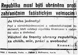 Zpočátku KSČ kritizovala vládu za přístup k sudetským Němcům a hájila jejich právo na sebeurčení. V polovině 30. let ale komunisté na příkaz Kominterny otočili a začali hájit demokratické Československo proti nacismu.[12]