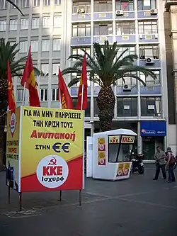 Komunistická strana Řecka je výrazně konzervativní, jako jedna z mála evropských komunistických stran se nedistancovala od stalinismu.[15] SYRIZU označuje za maloburžoazní reformistickou stranu, pro zásadní programové rozpory s ní odmítla vstoupit do vlády po volbách v lednu 2015.[16] Dva poslanci KKE v Evropském parlamentu vystupují jako nezařazení poté, co je ve frakci GUE-NGL nahradili zástupci SYRIZY.