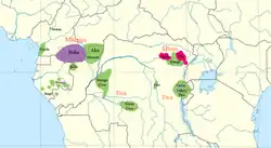 V Konžské demokratické republice žije 100 000 až 660 000 Pygmejů.[44] Obyčejně se má za to, že Pygmejové jsou přímými potomky lovecko-sběračských národů střední Afriky a jejího deštného pralesa ze střední doby kamenné.[45]