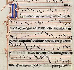 - Prvním z nich byl Magister Leoninus (Léonin, zástupce tzv. pařížské školy Notre Dame, tvořil asi kolem roku 1180 a napsal sborník organ – Magnus liber organi (Velká kniha organ), která byla zatím pouze dvojhlasá a převažoval v nich melismatický organový styl. Modální rytmika (a notace) se v jeho době teprve rozvíjela, takže rytmický průběh nelze zjistit zcela přesně.