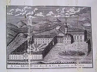 Klášter však existoval jen krátce, roku 1786 byl zrušen v rámci církevních reforem císaře Josefa II. Klášterní kostel zasvěcený Nanebevzetí Panny Marie se stal farním, konvent zbudovaný ke cti sedmi zakladatelů řádu (Bonfilius Monaldi, Bonajunkta Manetti, Manettus dell' Antella, Amadeus Amidei, Hugo Lippi-Ugoccioni, Sosteneus di Sostegno a Alexis Falconieri[zdroj?]) byl přeměněn na zámek. Vnitřní zařízení konventu přešlo do litoměřické rezidence.[2]