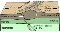 - dvě pevninské desky se zapříčí a nastane horotvorný proces (orogeneze) – např. zasunující se Indická deska pod Eurasijskou, což vyúsťuje ve vznik Himálají