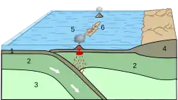 - jedna oceánská deska se podsouvá pod druhou – vytvářejí se příkopy, nad horní deskou přitom vzniká oblouk sopečných ostrovů, který je rovnoběžný s příkopem